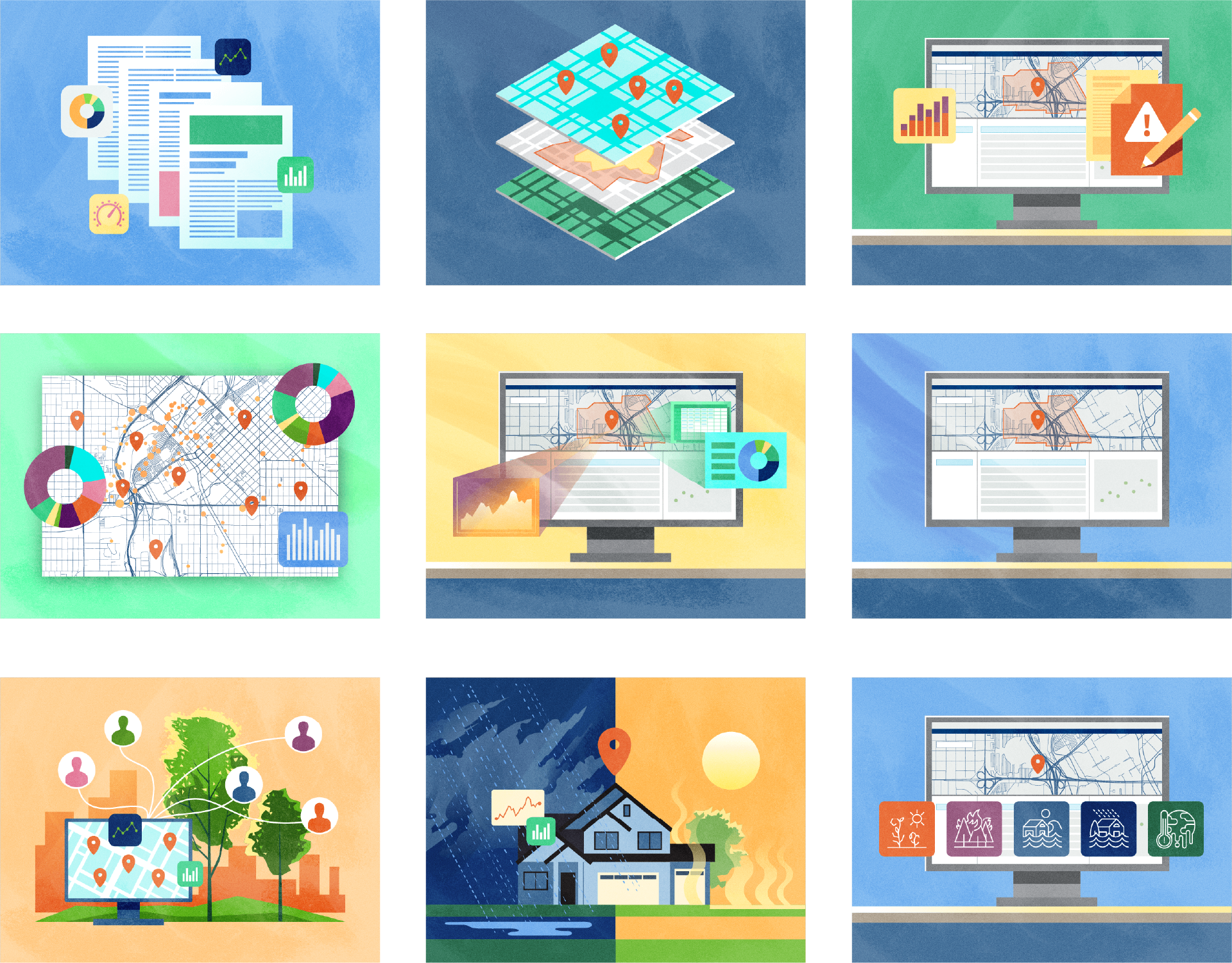This series of illustrations was commissioned for part of a government climate web portal developed in partnership with Esri. The portal allows users to assess varying climate risks by location via an interactive map and dashboard.