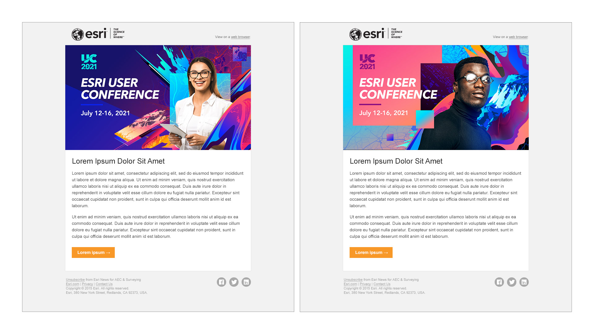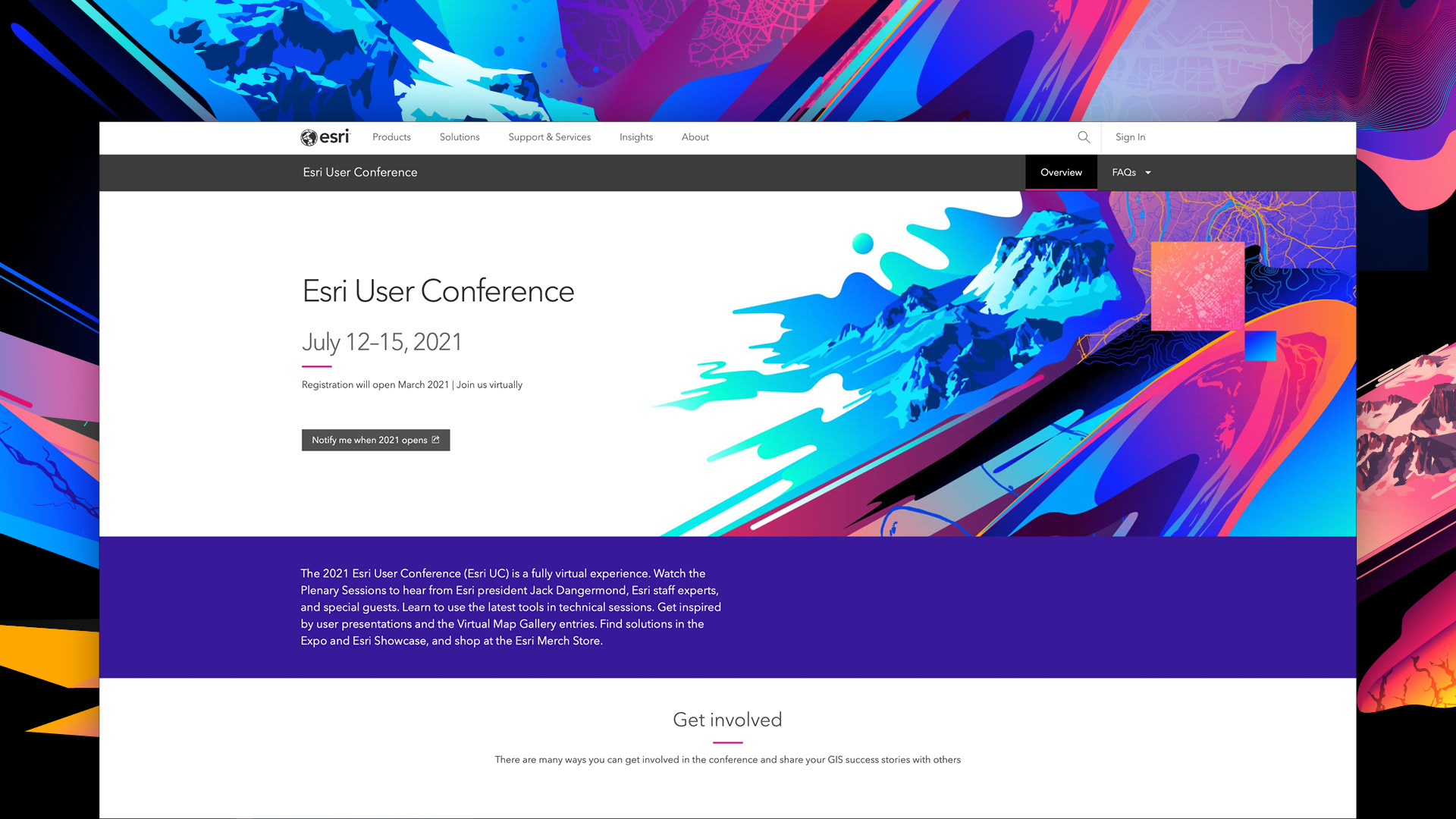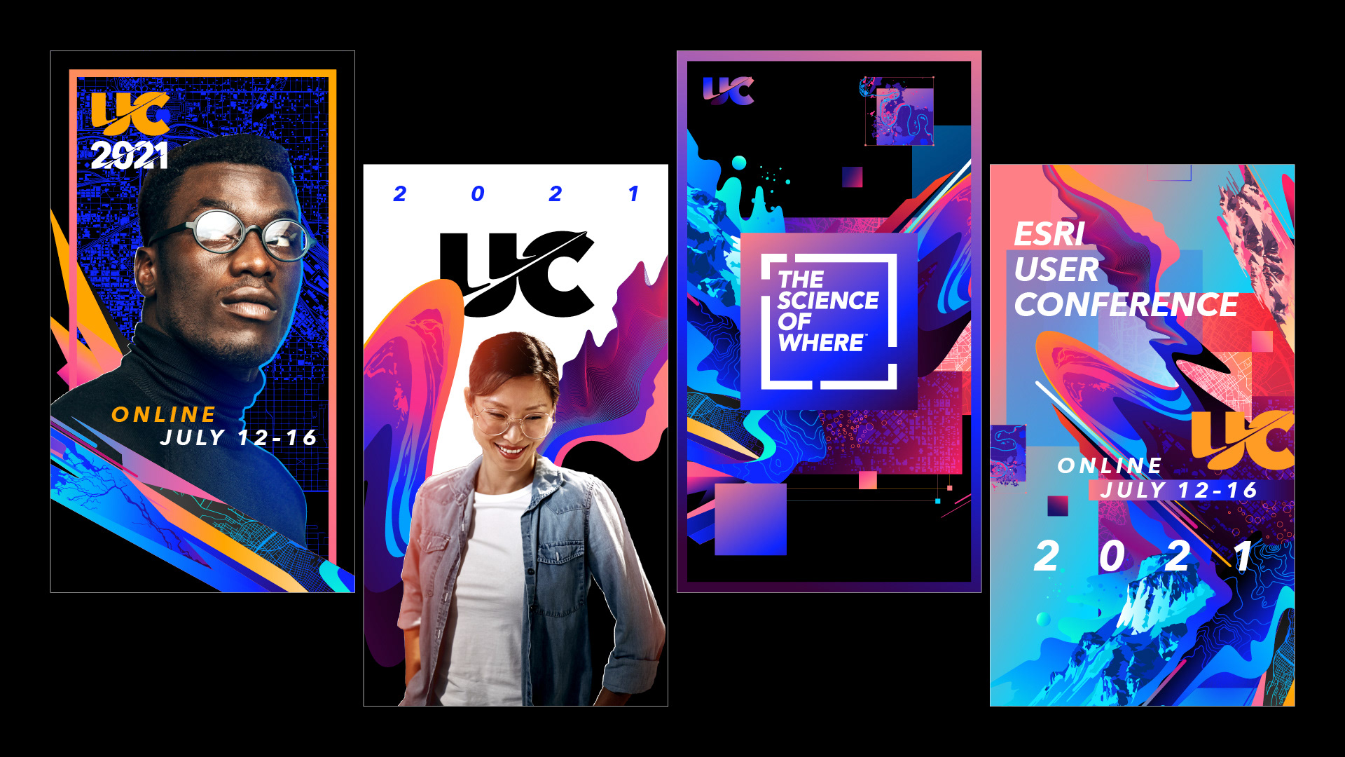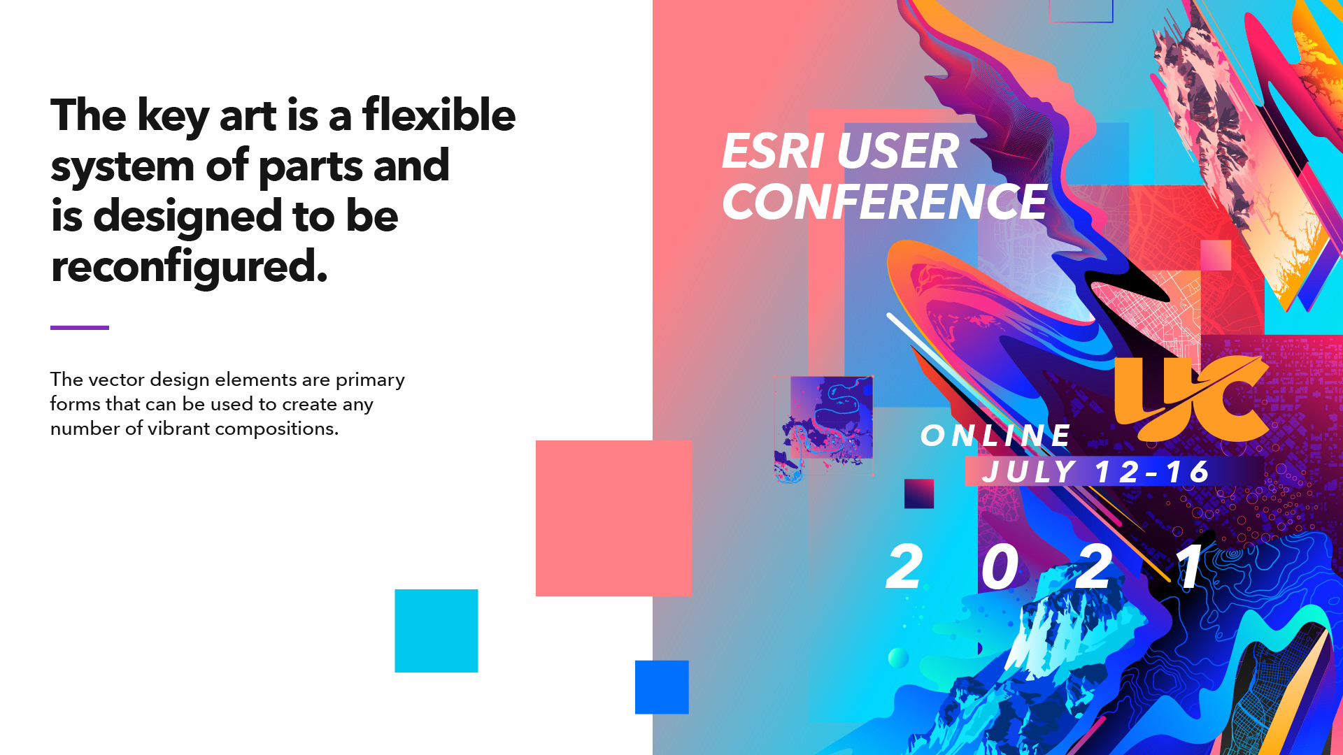 Esri's annual User ConferenceĀ is the company's largest and most important event. The event typically boasts thousands of in-person attendees, but due to the Covid-19 pandemic, the event was moved from its usual location at the San Diego convention center to a fully online event to be broadcast from Esri's headquarters in California. I was charged with designing the visual identity for the event and providing art direction for its implementation across a range of media.